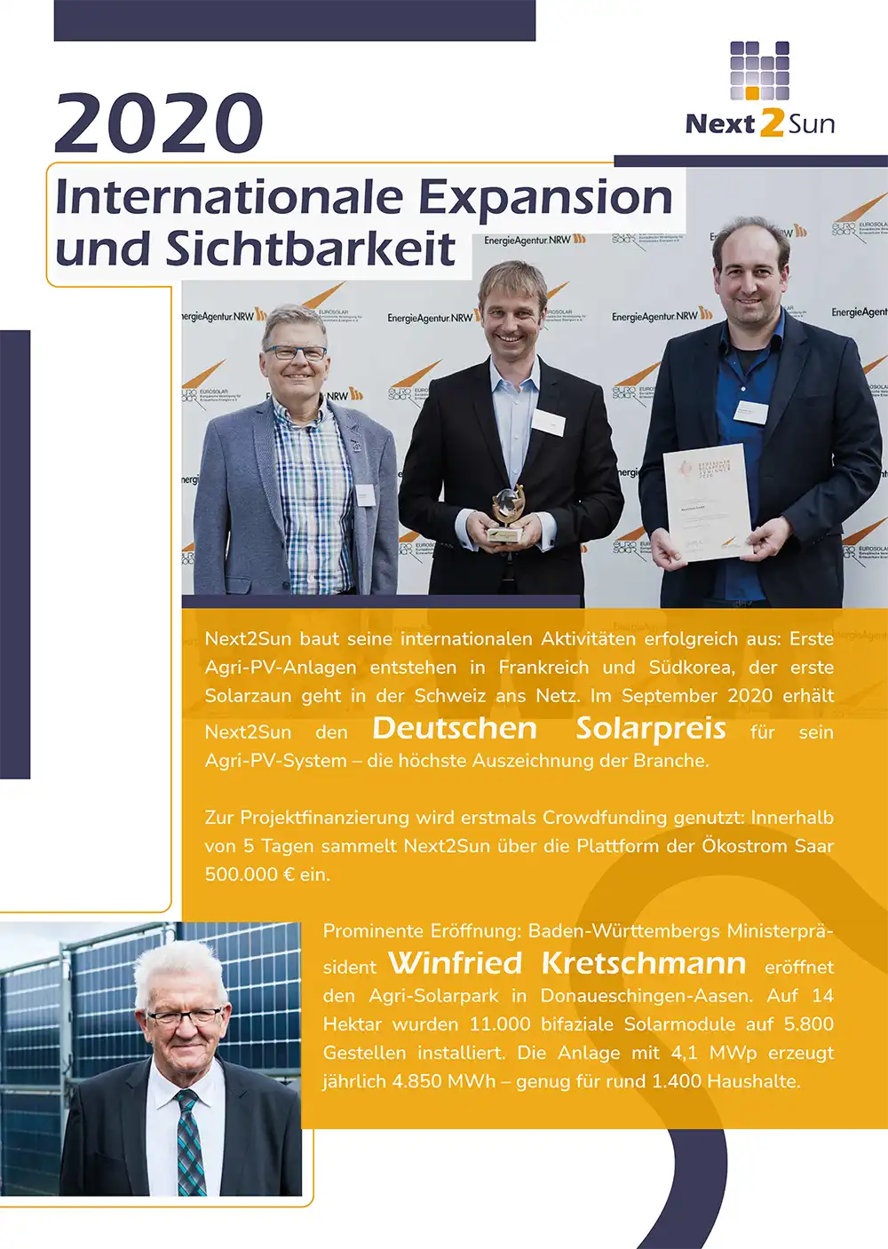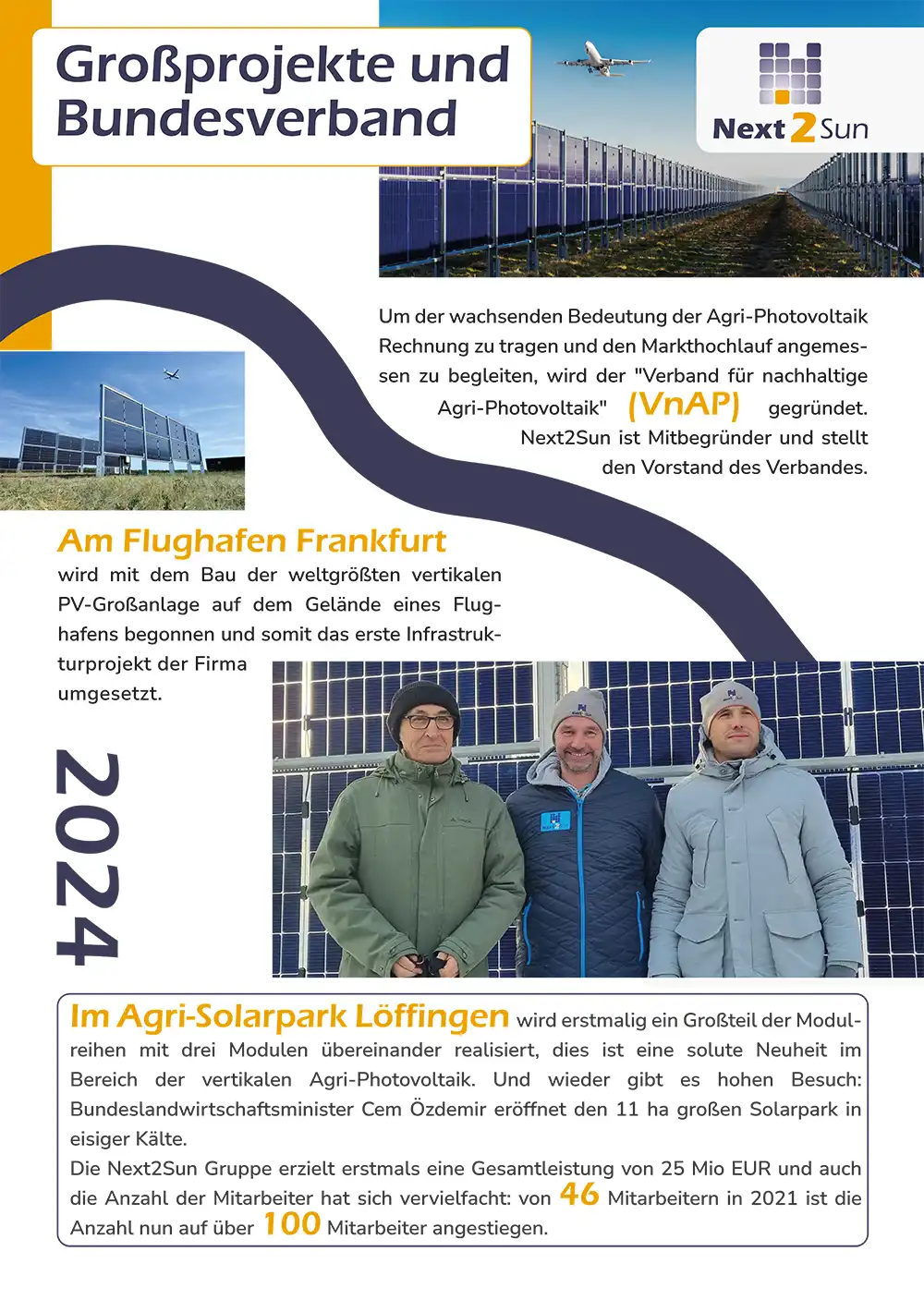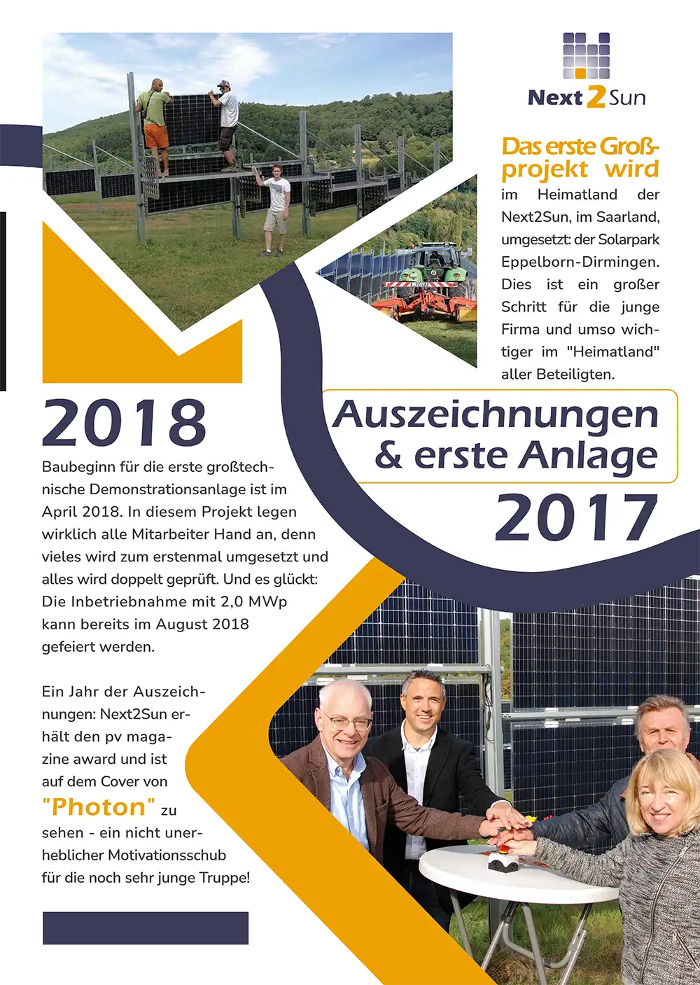 Die Next2Sun ist Erfinder, Innovations- und Technologieführer bei vertikaler bifazialer Photovoltaik. Das Grundkonzept vertikal installierter, bifazialer Solarmodule verlagert die Solarstromproduktion in Zeiten sonst geringer Verfügbarkeit und vermeidet die Überbauung landwirtschaftlicher Nutzflächen.